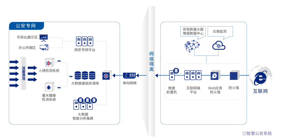 實現圍繞公安監管業務的各項功能,建立公安機關"打防管控"一體化綜合管理平臺。實現對等級保護檢查的管理,創建通報預警、應急響應機制,建立7x24小時的監測體系與全天候全方位網絡安全態勢感知分析能力,利用基于可視化、集成式、一站式的技術平臺,實現情報共享,以及違法犯罪的偵察打擊、追蹤溯源,形成對網絡黑灰產的威懾作用。創新業務流閉環,打通公安業務"最后—公里"。為支撐公安快速監管業務,在發現、通知、整改等環節,充分利用各類終端應用,包括安卓、蘋果在內的客戶端,形成事件發現、確認、通報、處置完整無紙化閉環。