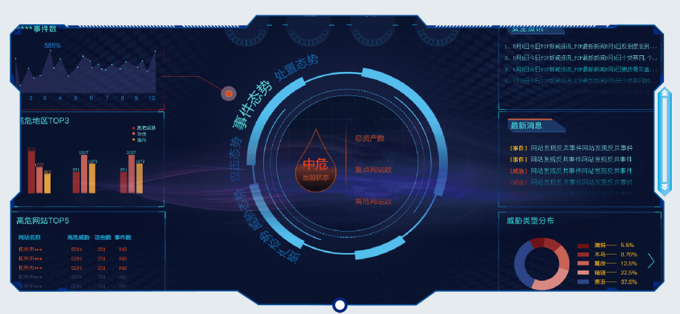 該市智慧公安系統結合網安業務流程和工作重點,多維度展示各類網安業務重點數據,以網絡資產管理為基礎,結合事前掌握隱患、事中監測攻擊、事后管理實踐的業務思路,形成總體態勢、安全隱患、安全攻擊、安全事件、通報預警等六個維度的可視化展示。同時,根據數據碰撞比對、智能分析模型應用,形成數據分析情報。