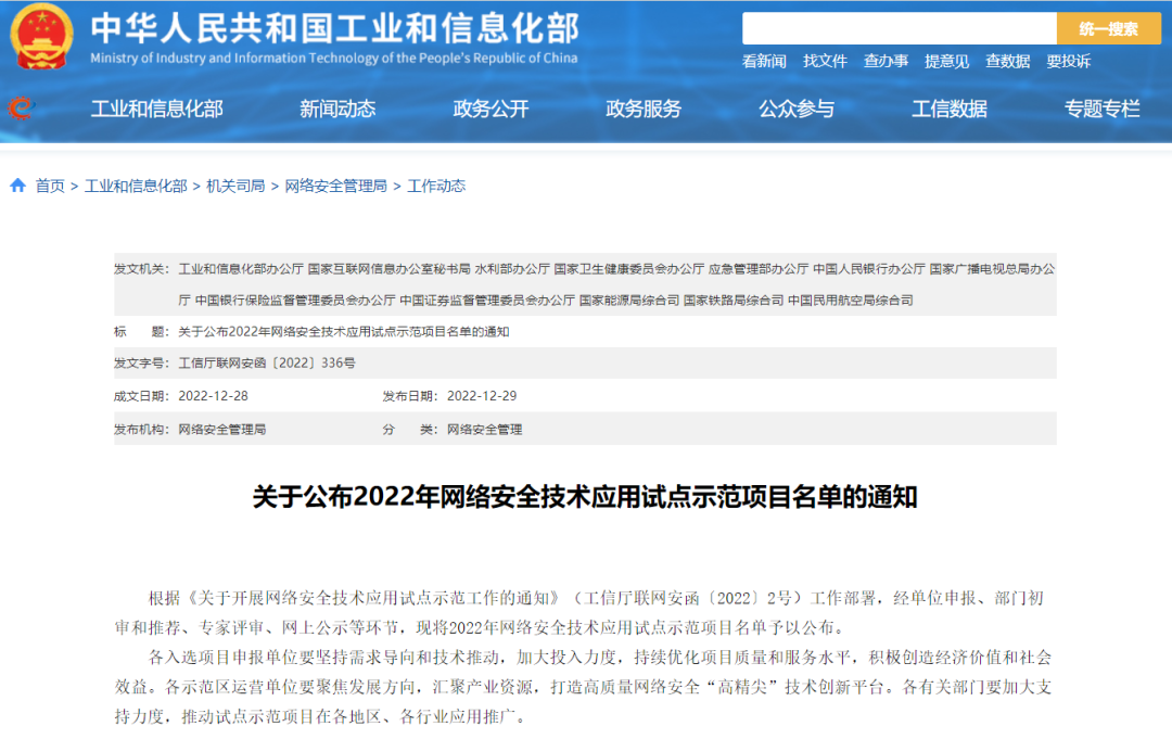 2022年網(wǎng)絡(luò)安全技術(shù)應(yīng)用試點(diǎn)示范項(xiàng)目評(píng)審由工信部聯(lián)合11部門共同組織開展,以新型基礎(chǔ)設(shè)施安全、數(shù)字化應(yīng)用場(chǎng)景安全、安全基礎(chǔ)能力提升為主線,面向公共通信和信息服務(wù)、能源、交通、水利、應(yīng)急管理、金融、醫(yī)療、廣播電視等重要行業(yè)領(lǐng)域網(wǎng)絡(luò)安全保障需求,從網(wǎng)絡(luò)安全共性技術(shù)、網(wǎng)絡(luò)安全創(chuàng)新服務(wù)、網(wǎng)絡(luò)安全“高精尖”技術(shù)創(chuàng)新平臺(tái)等9個(gè)重點(diǎn)方向,遴選出一批技術(shù)先進(jìn)、應(yīng)用成效顯著的試點(diǎn)示范項(xiàng)目,旨在加強(qiáng)網(wǎng)絡(luò)安全先進(jìn)技術(shù)應(yīng)用引導(dǎo)作用,推動(dòng)網(wǎng)絡(luò)安全產(chǎn)業(yè)的高質(zhì)量發(fā)展。