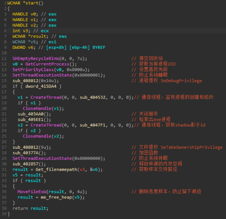 我們可以分析出病毒設置了程序/線程的優先級和防止系統休眠。還有一個sub_408012的函數,利用RtlAdJustPrivilege進行提權。