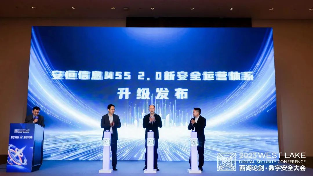 MSS安全托管運營服務今年迎來了新的規劃與愿景。論壇上,宋皆榮、王軍民、袁明坤上臺共同發布“安恒信息MSS 2.0新安全運營體系”。