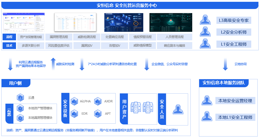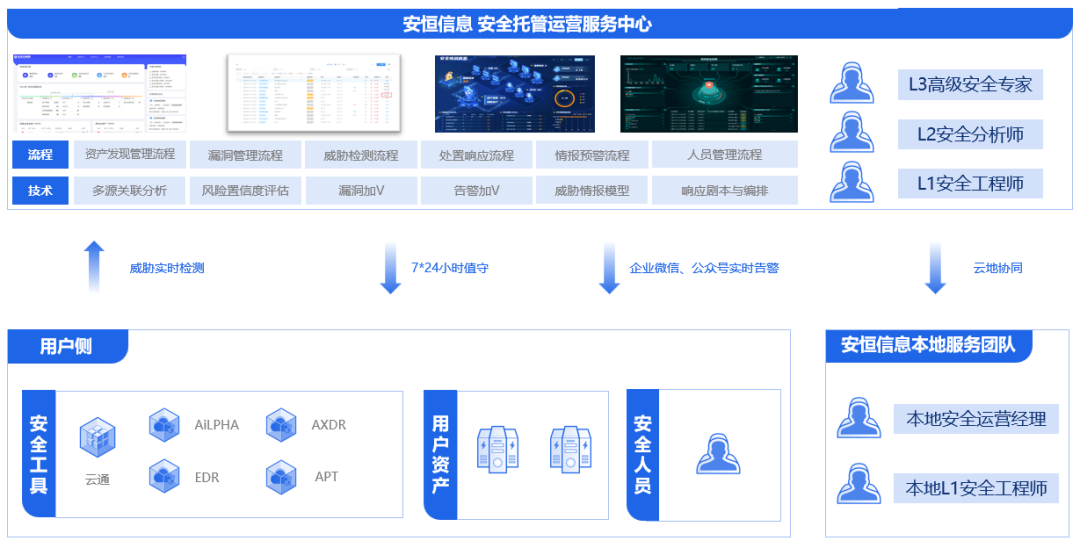 7*24小時在線的云端三級安全運營專家以及分布在全國各城市的本地服務團隊,通過云端托管運營服務平臺實現用戶側安恒邊界、流量、終端設備的托管,并按照資產發現、暴露面檢測、互聯網漏洞掃描與管理、威脅實時檢測響應等運營流開展工作。