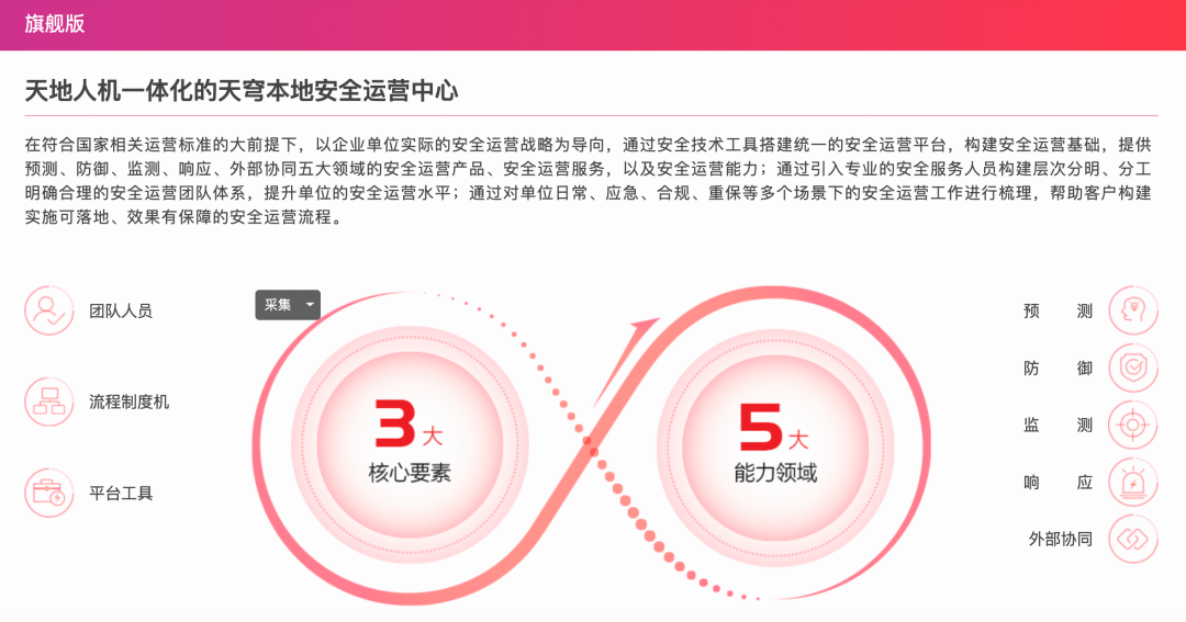 在符合國家相關運營標準的大前提下,以企業單位實際的安全運營戰略為導向,通過安全技術工具搭建統一的安全運營平臺,構建安全運營基礎,提供預測、防御、監測、響應、外部協同五大領域的安全運營產品、安全運營服務,以及安全運營能力;通過引入專業的安全服務人員構建層次分明、分工明確合理的安全運營團隊體系,提升單位的安全運營水平;通過對單位日常、應急、合規、重保等多個場景下的安全運營工作進行梳理,幫助用戶構建實施可落地、效果有保障的安全運營流程。