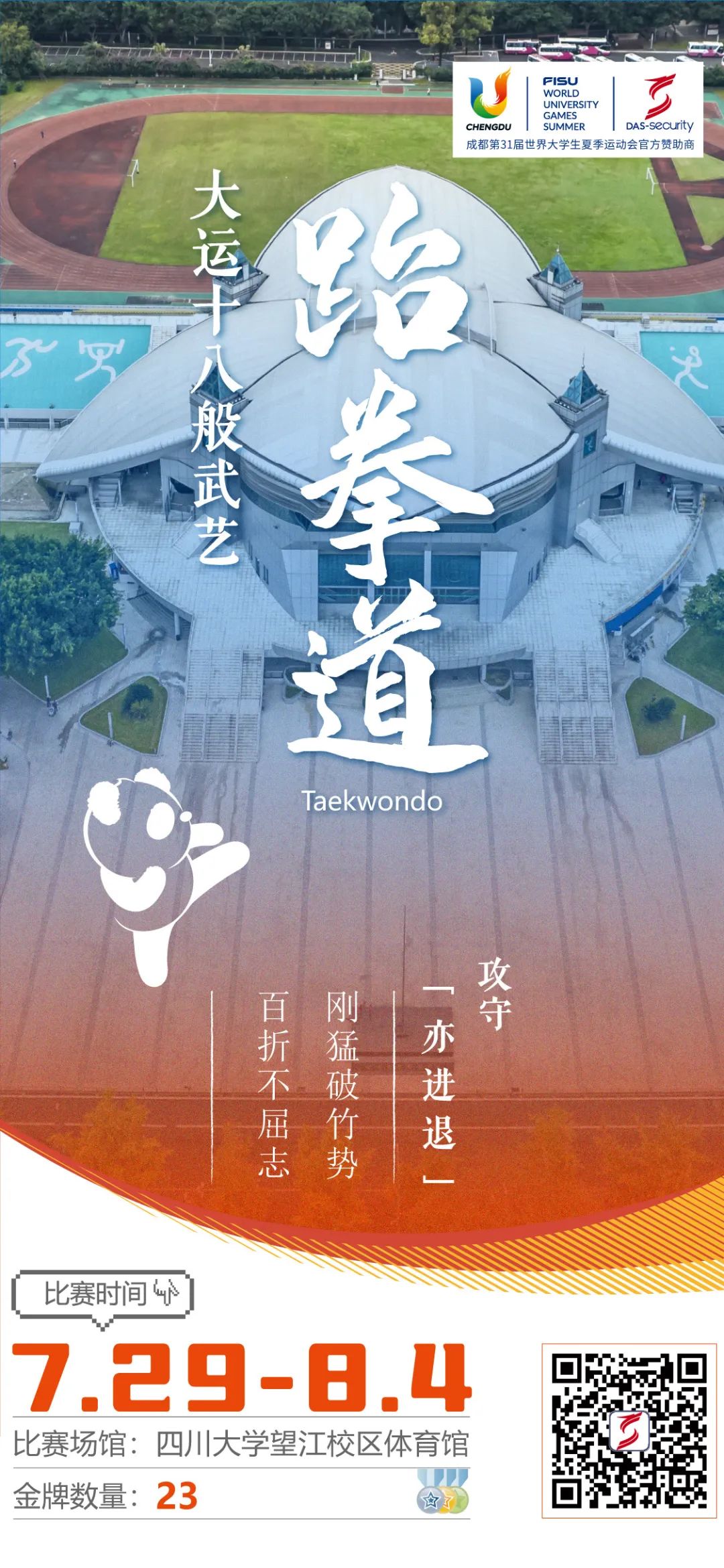 跆拳道起源于朝鮮半島,距今已有兩千多年的歷史,經過東亞文化的發展,以“始于禮,終于禮”的武道精神為基礎。本屆大運會中跆拳道賽事將持續7天,包括競技賽、品勢賽兩大類別,共計產生23枚金牌。