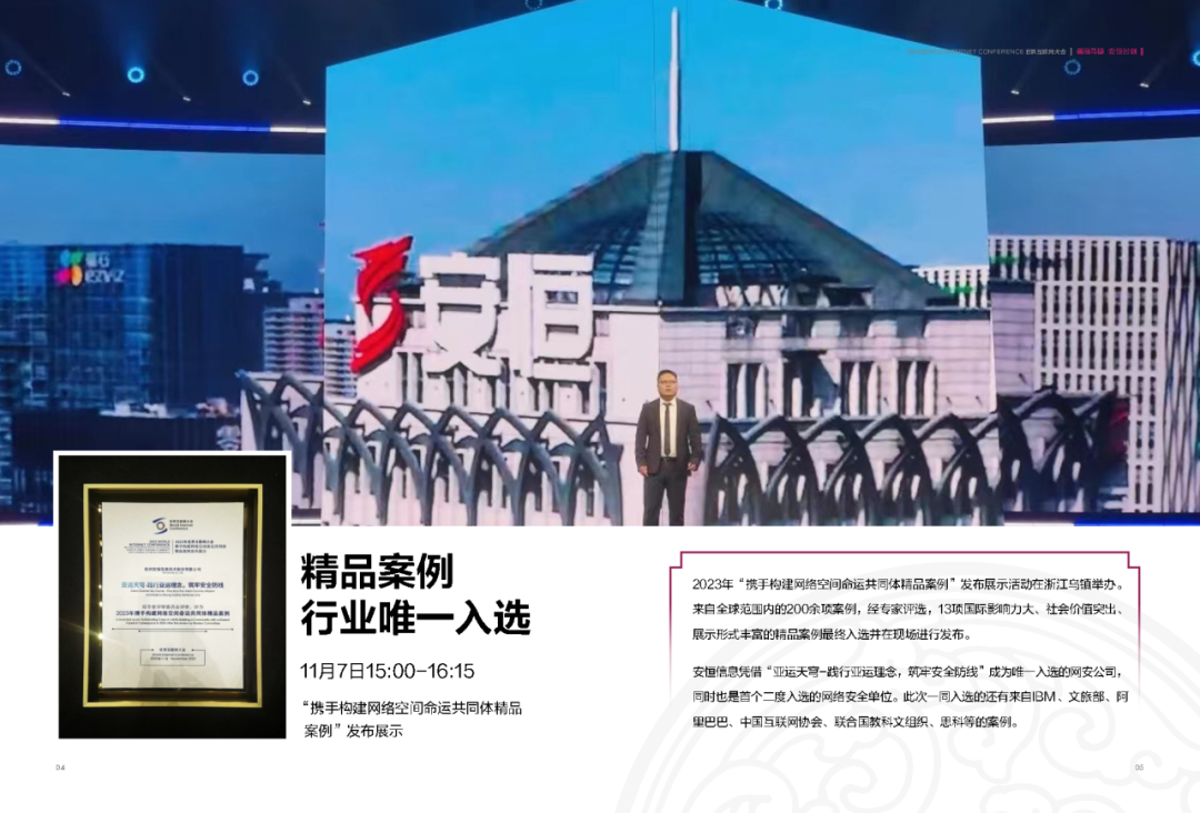 在2023年“攜手構建網絡空間命運共同體精品案例”發(fā)布展示活動中,安恒信息“亞運天穹-踐行亞運理念,筑牢安全防線”入選,成為本次發(fā)布活動中唯一一家國內網絡安全企業(yè),同時也是首個二度入選的網絡安全單位。