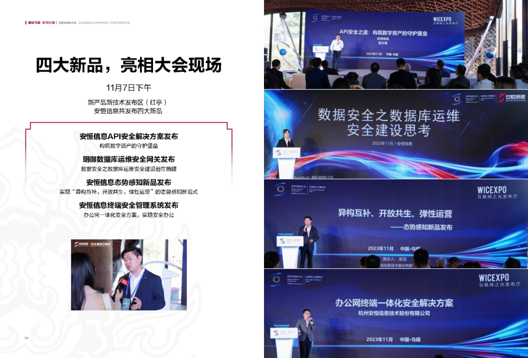 烏鎮(zhèn)新產品新技術發(fā)布會舉辦,安恒信息精心打磨的態(tài)勢感知、API安全解決方案、終端安全管理系統(tǒng)、數據庫運維安全網關四大新品現(xiàn)場發(fā)布。