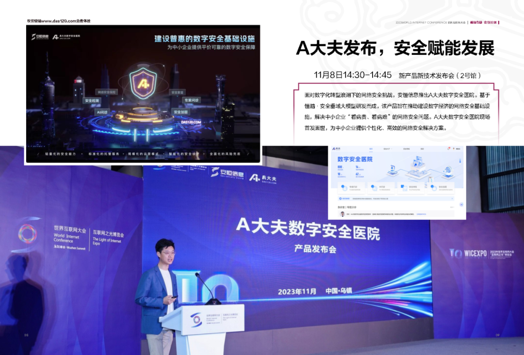 歷經三年打磨,基于恒腦·安全垂域大模型打造的“A大夫數字安全醫(yī)院” ”是安恒信息針對中小企業(yè)研發(fā)和建設的普惠數字安全基礎設施,在2023世界互聯(lián)網大會期間正式升級發(fā)布。