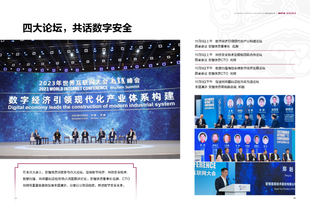 在烏鎮(zhèn)峰會期間,安恒信息董事長范淵、CTO劉博、高級副總裁鄭赳分別參加四大論壇,圍繞多個行業(yè)熱點話題展開探討,共話數字安全未來。