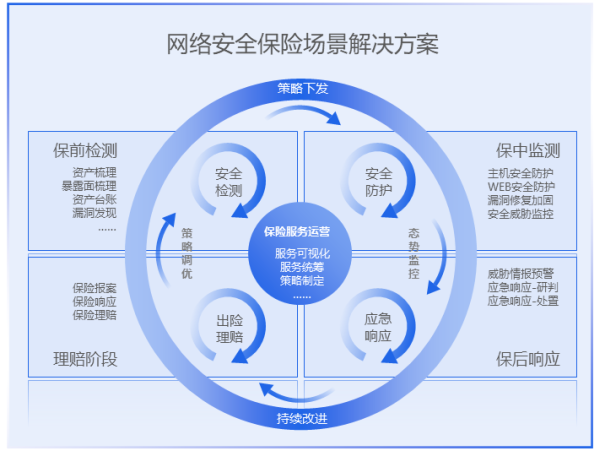 客戶可以根據(jù)自己企業(yè)業(yè)務(wù)場(chǎng)景的屬性需求,選擇郵件反詐,勒索防護(hù),網(wǎng)站防護(hù)或者綜合防護(hù)等場(chǎng)景的網(wǎng)絡(luò)安全保險(xiǎn)服務(wù)解決方案,由安恒提供專業(yè)的安全防護(hù)能力,加上保險(xiǎn)公司提供的網(wǎng)絡(luò)安全保險(xiǎn)能力,形成網(wǎng)絡(luò)安全保險(xiǎn)服務(wù)的完整閉環(huán):涵蓋企業(yè)投保前,投保中和出險(xiǎn)后,全方位為被保險(xiǎn)客戶提供風(fēng)險(xiǎn)管理服務(wù)能力。