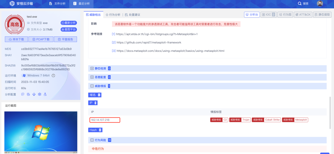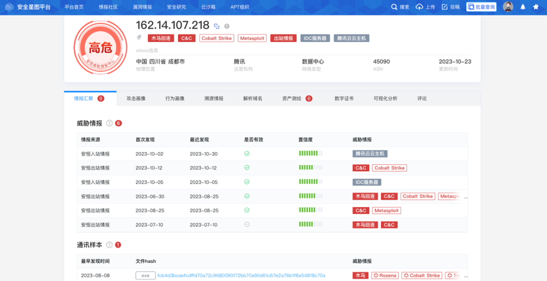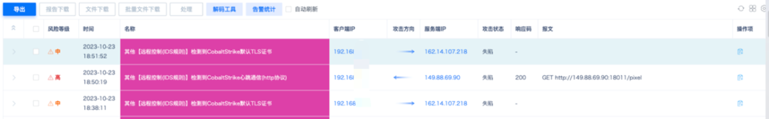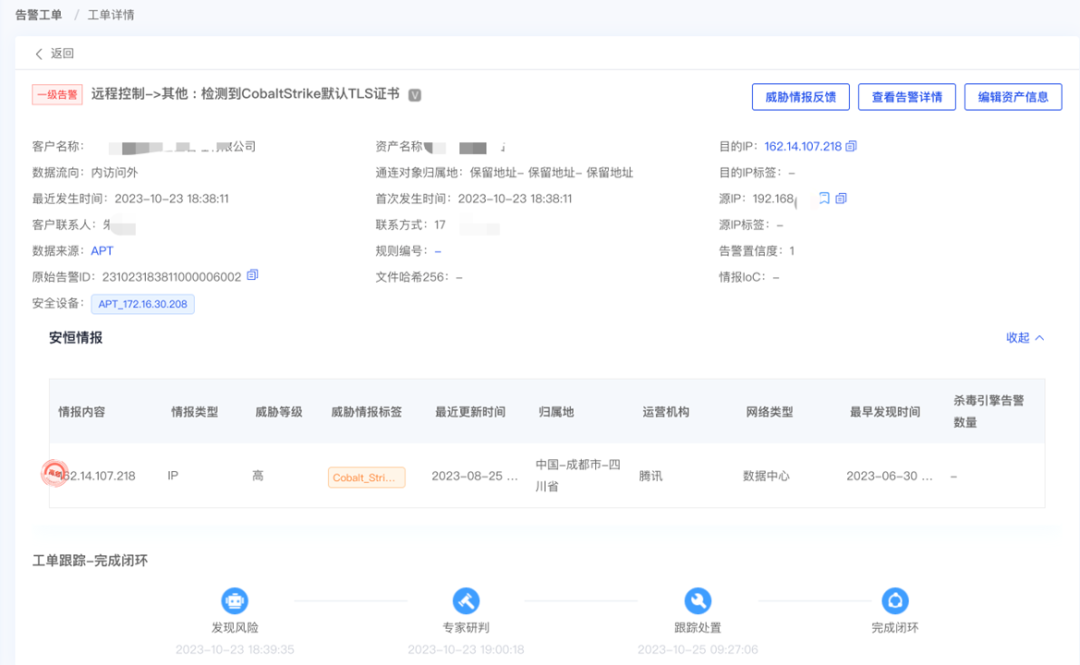 10月的某天凌晨,云端安全分析人員發(fā)現(xiàn)該供應商某管理系統(tǒng)出現(xiàn)異常告警:CS特征流量告警,通過對告警詳情分析,確認機器失陷。值班人員立即電話聯(lián)系用戶對接人,在說明情況并得到用戶確認后,斷網(wǎng)處理的同時對CS外連IP進行封堵。