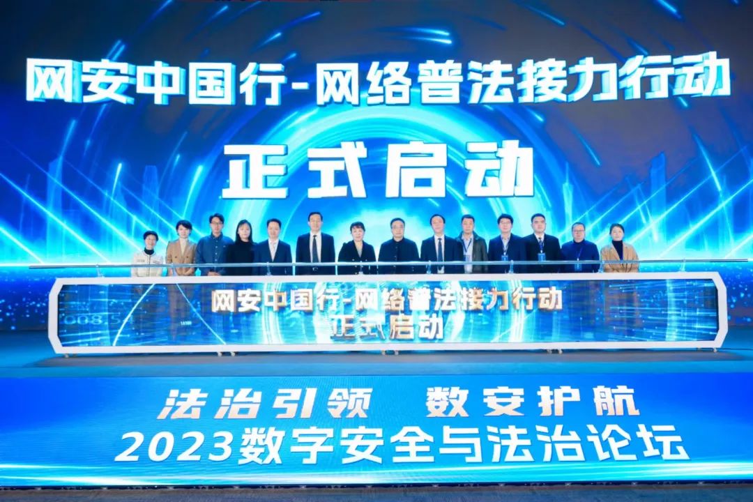 論壇現場,中央網信辦法治局、中國網絡安全協會、浙江省委網信辦、杭州市委宣傳部、杭州市余杭區政府與安恒信息等9家首批接力單位共同啟動了“網安中國行——網絡普法接力行動”。