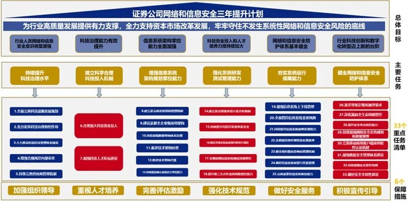 規劃以牢牢守住不發生系統性金融風險的底線為指導思想,制定了六大主要任務,33個重點任務,6個保障措施。力爭到 2025 年,通過組織引導證券公司積極落實各項行動舉措,促進證券行業網絡和信息安全建設取得扎實成效: