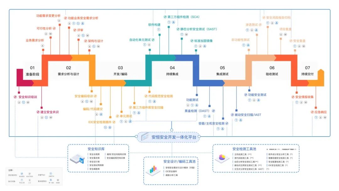 安恒信息可為證券行業制定安全管控流程,從立項、需求分析、方案設計、開發實現、測試、上線交付等階段介入安全管控手段。同時搭建安全研發管控平臺,支撐全生命周期安全管控及工具支持。安全評審、安全培訓、安全知識維護、安全技術實踐(漏洞掃描、代碼審計、滲透測試、用例測試)貫穿整個研發全生命周期管控流程。