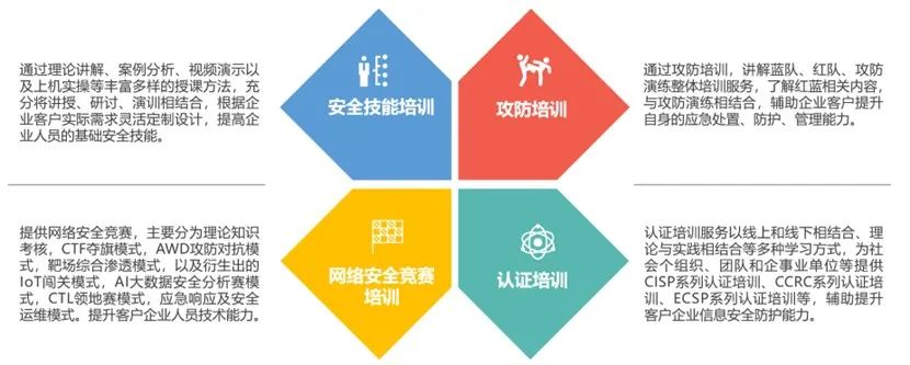 安恒信息人才培養主要通過安全能力認證培訓服務以及客戶實際需求為主,以線上和線下相結合、理論與實踐相結合等多種學習方式,為社會各組織、團體和企事業單位等提供認證和培訓服務,提升客戶企業信息安全防護人員的能力。