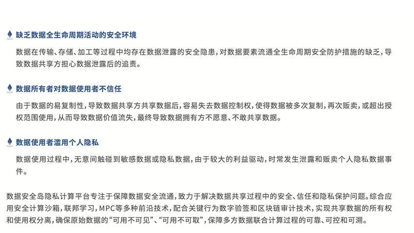 由于敏感數據時常發生數據泄露和缺乏有效的安全保障手段,導致數據擁有方都不愿開放和共享數據。究其原因既有缺乏相關法律法規導致的責任認定不清的問題,也有數據安全共享技術的缺失制約了政府部門及企業間數據的開放共享。制約數據要素流通的主要挑戰表現為以下三點: -