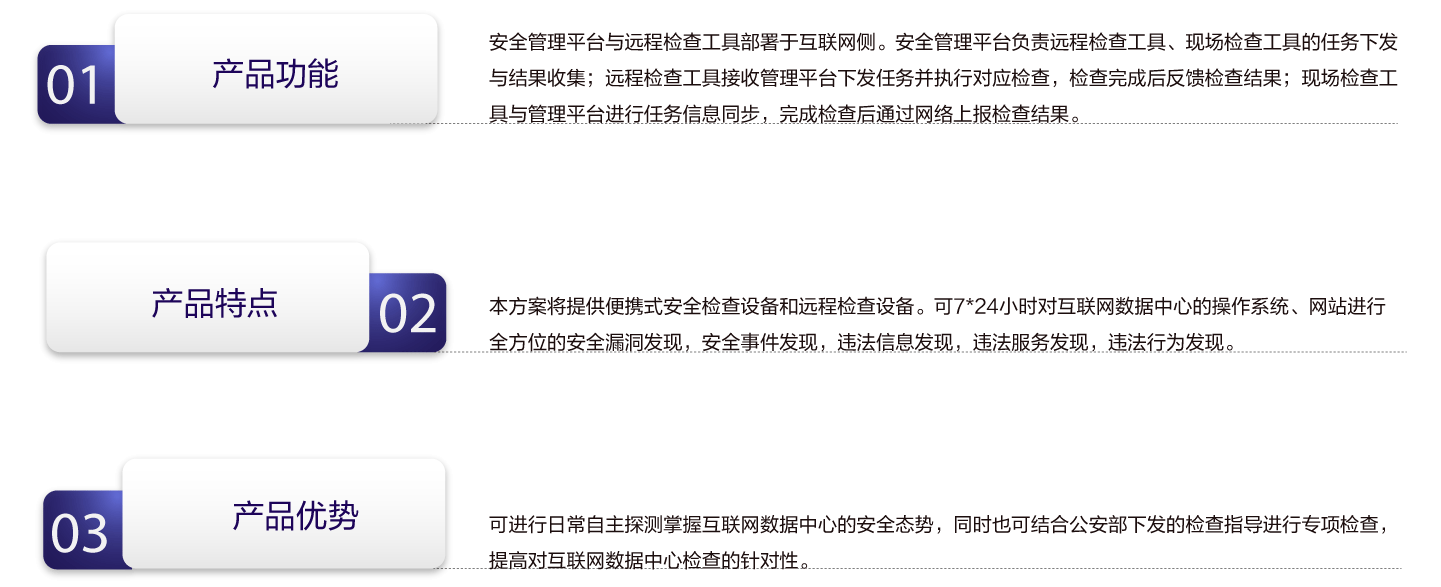 互聯網數據中心安全檢查工具是公安機關開展互聯網安全檢查工作的網絡安全專業檢查工具,兼顧高效、準確、便攜、易用等特點。在軟硬件設計上以《公安機關互聯網安全監督檢查規定》(公安部151號令)為指導依據。