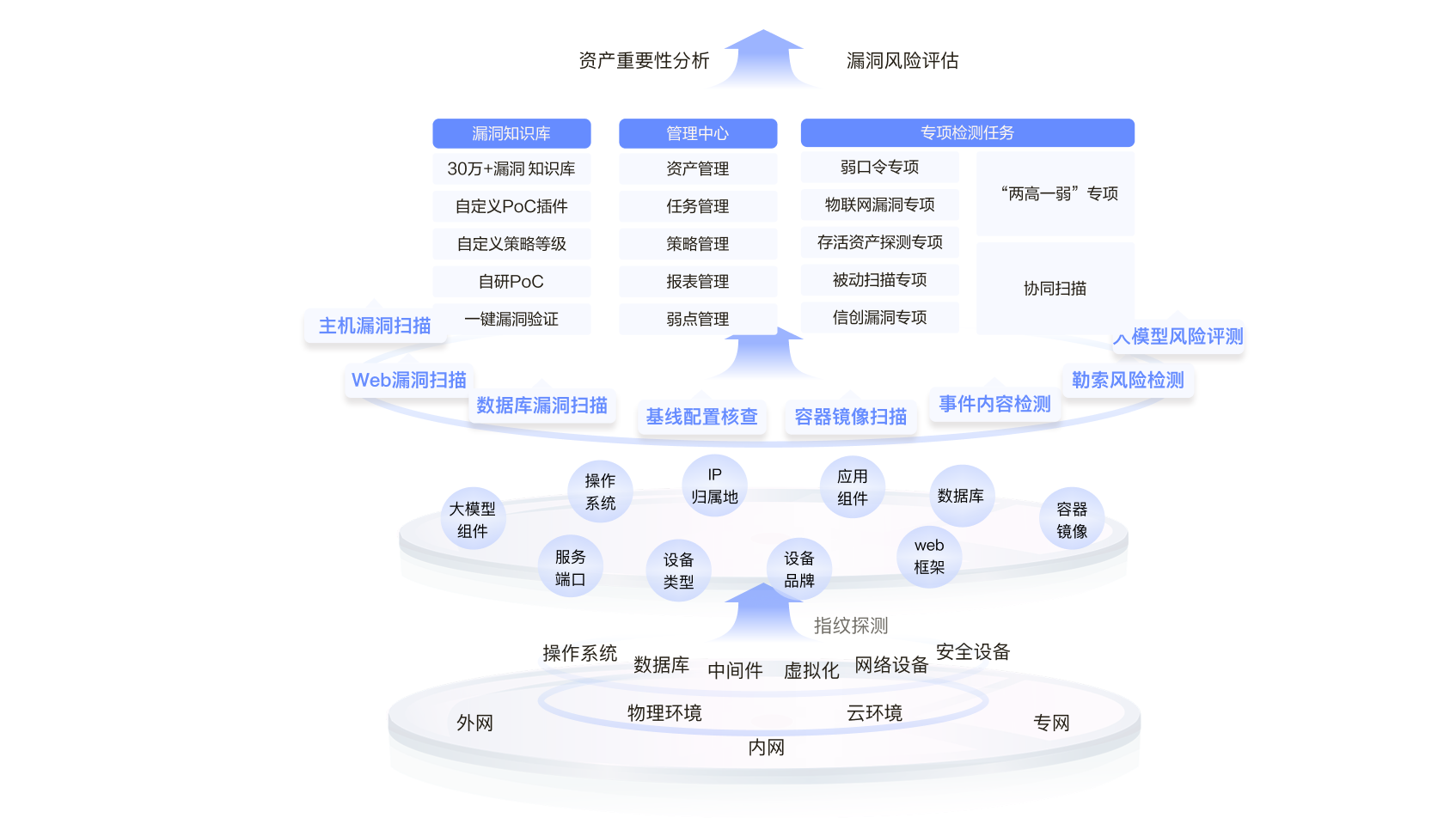 豐富的資產指紋庫,全自動IP段資產探測,靈活的端口探測方式、多粒度服務探測,自動準確識別資產開放端口、服務旗標、Web指紋、操作系統、主機名以及大模型服務