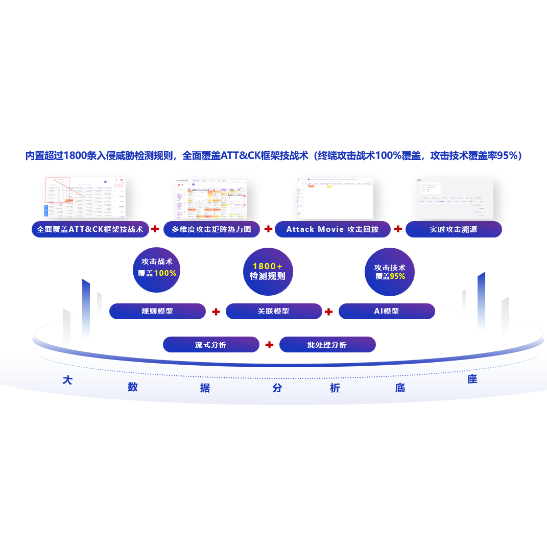 安恒一體化平臺內置了超過1800條入侵威脅檢測規則,全面覆蓋Mitre attack攻擊框架。在規則模型+關聯模型+AI模型等多維分析模型的加持下能實現對海量終端安全事件的分析,針對入侵行為進行全鏈路秒級告警、自動響應。