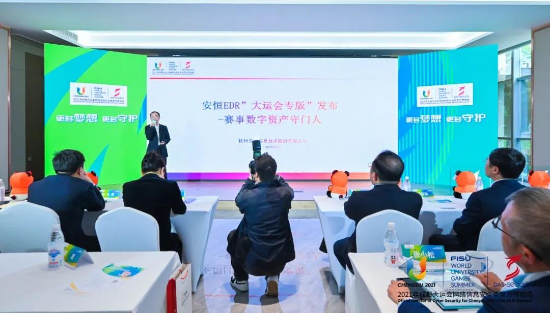 4月7日,成都大運會(網絡信息安全類)官方贊助商安恒信息升級發布會暨“西部網絡安全總部”啟動儀式在成都高新區安恒大廈舉行。安恒信息成為了從成都大運會的“賽事合伙人”進而成為“城市合伙人”的成功典范,創造了數個“首個”。現場,安恒EDR“大運會專版”重磅發布,安恒信息副總裁劉思宇作專題匯報。對于安恒EDR大運會專版的發布,劉思宇提出四大關鍵詞“智能、實戰、簡單、責任”,體現了安恒終端安全對于大型賽事網絡安全保障的信念和態度。